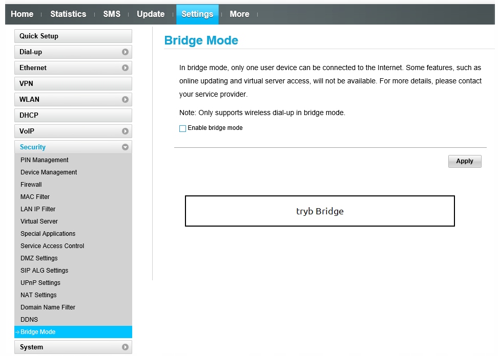 CS Voice – urządzenie zachowuje się jak bramka GSM, która jednocześnie rozdziela internet. Po podłączeniu telefonu stacjonarnego, możesz z niego dzwonić i odbierać połączenia – wszystko za pośrednictwem włożonej do routera karty SIM. Podczas rozmowy internet przełącza się na pasmo 3G, a po jej zakończeniu znów przełącza się na LTE.