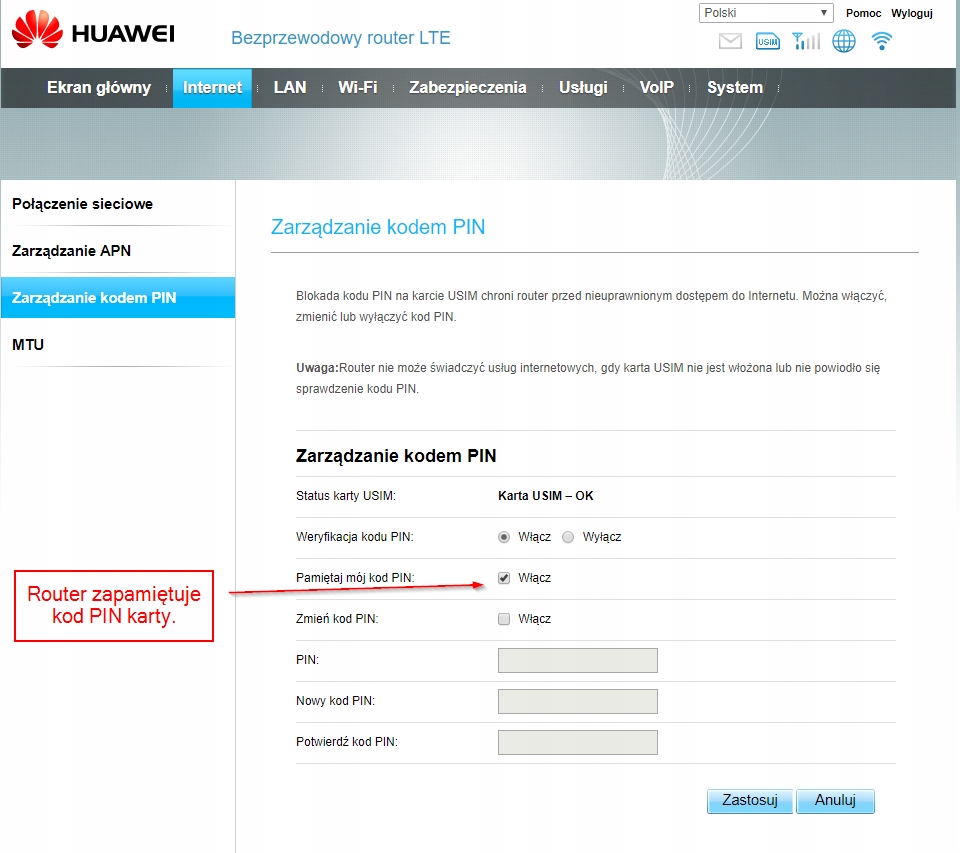 - router zapamiętuje kod PIN