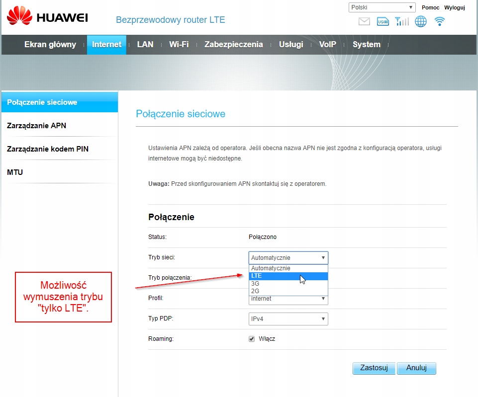 - tryby – Auto, Tylko LTE oraz Tylko 3G