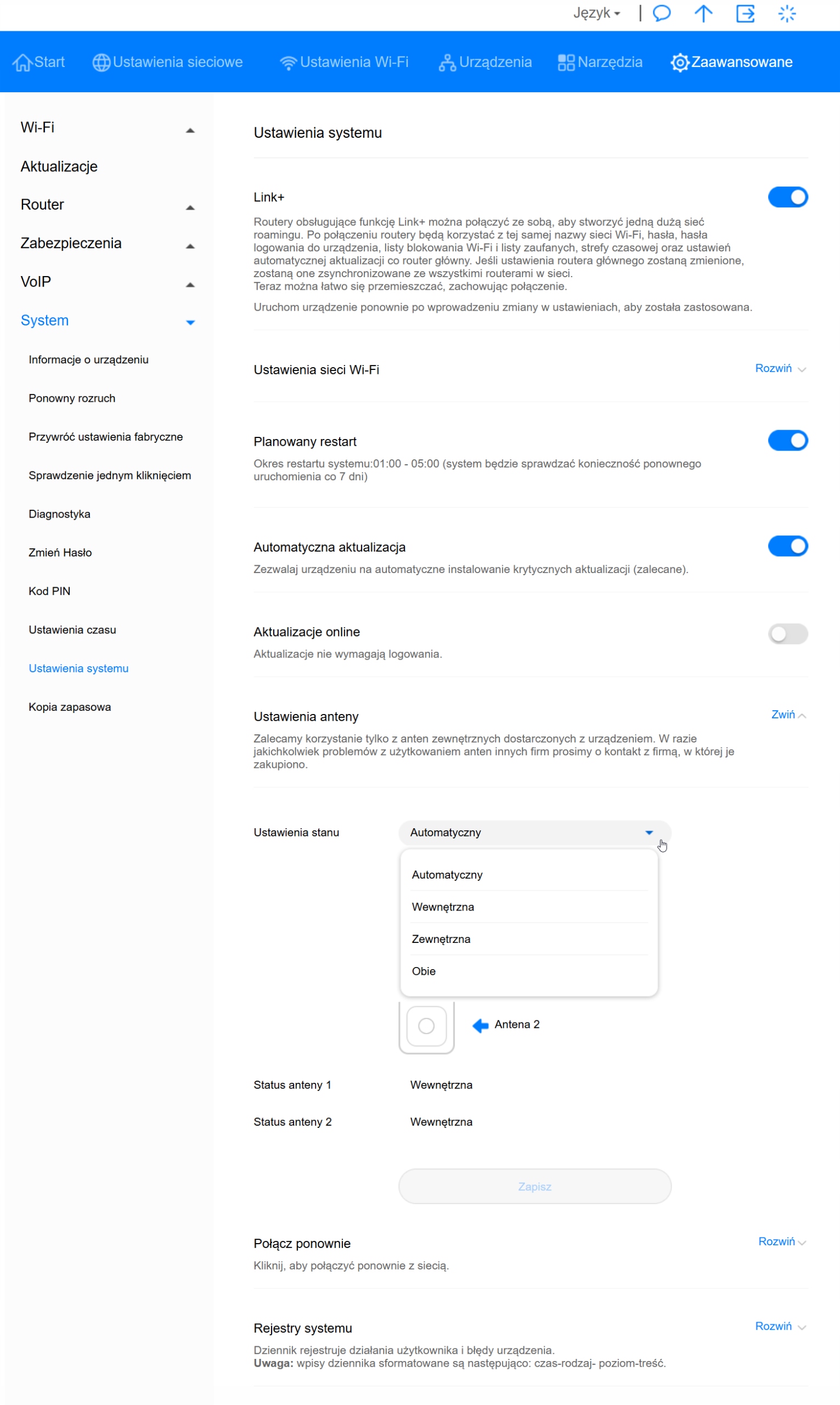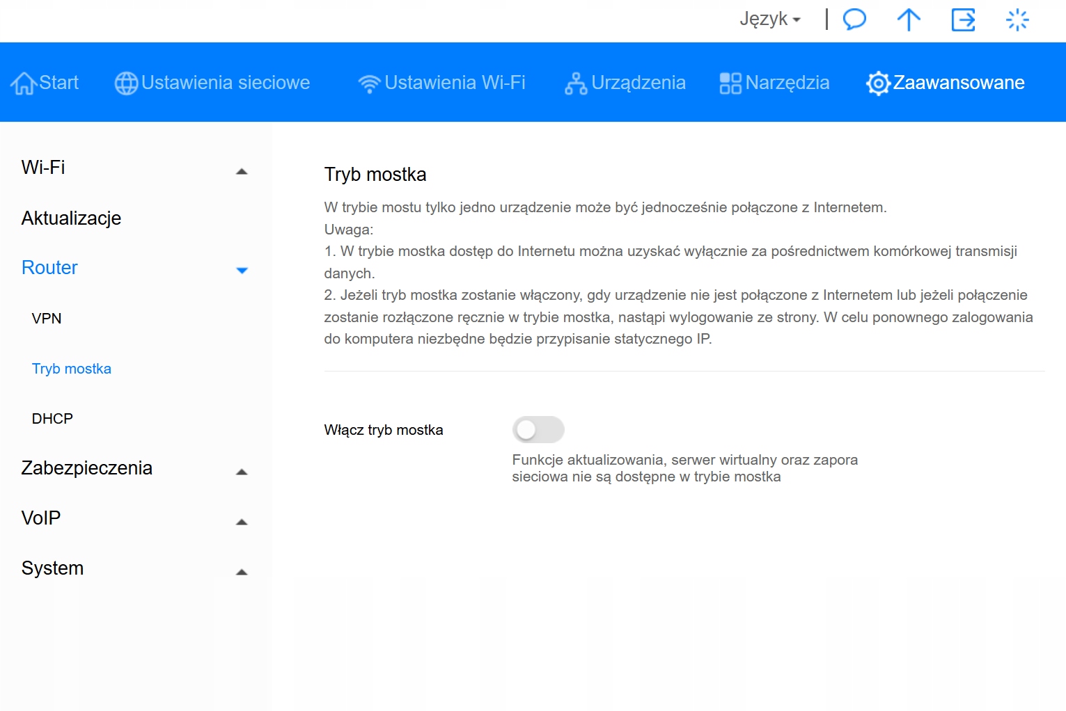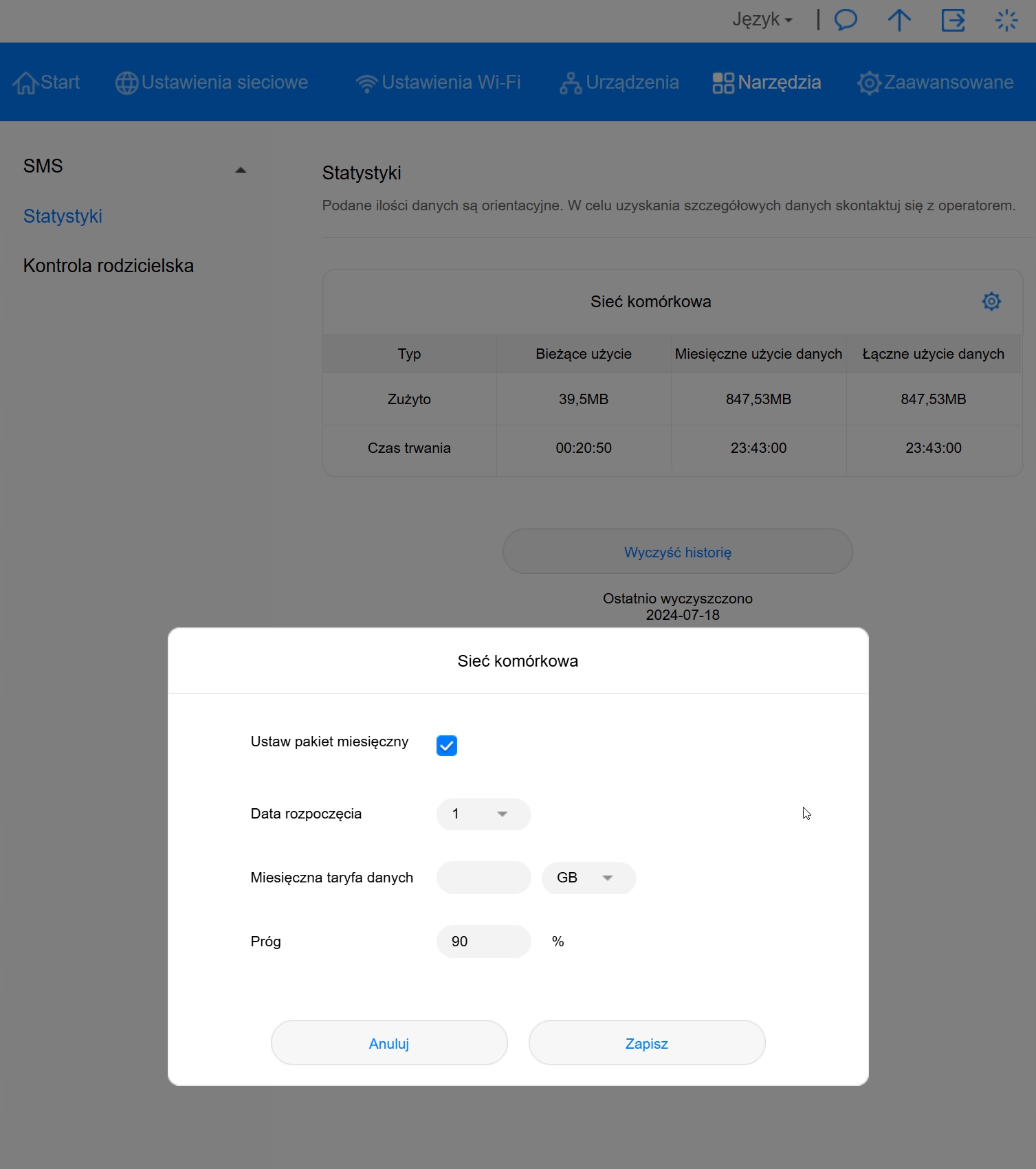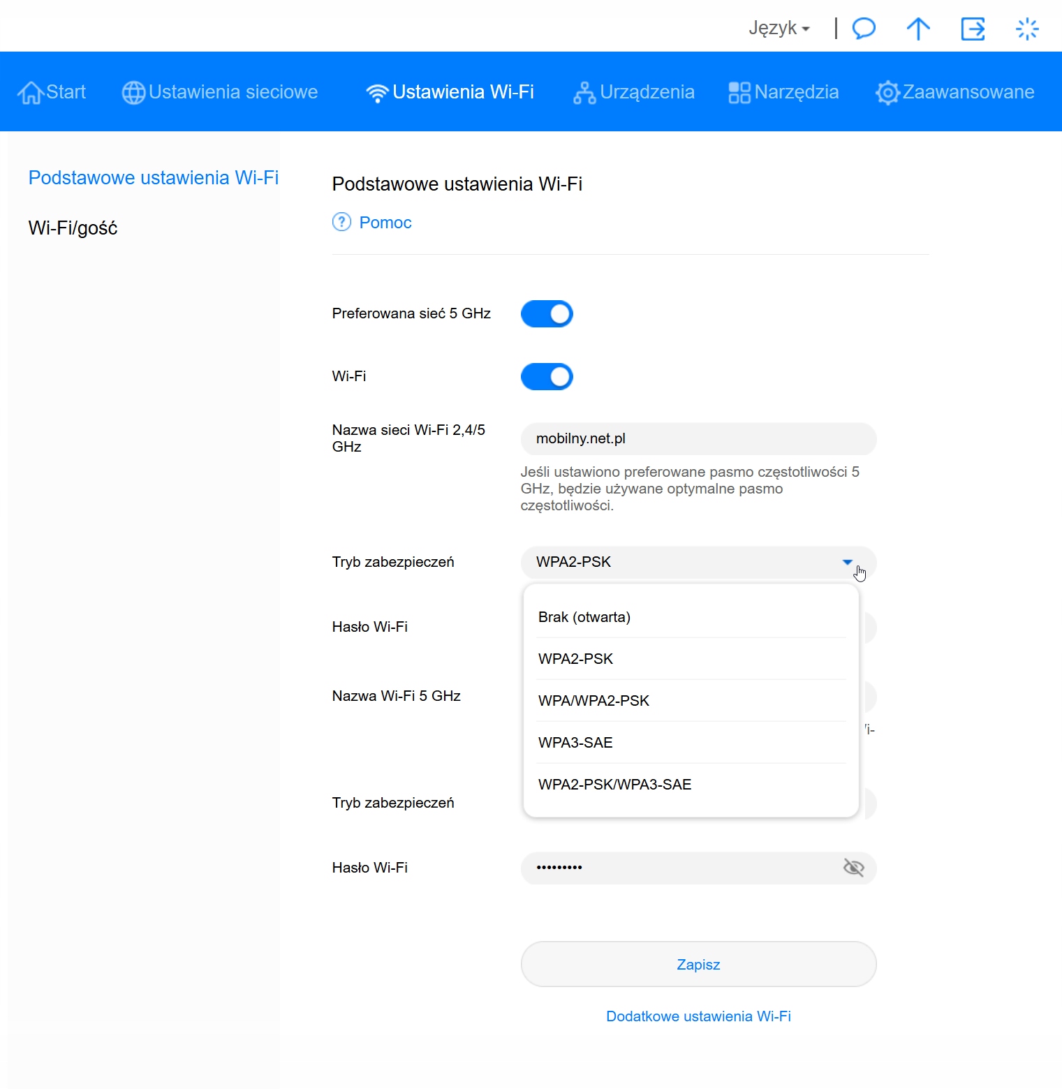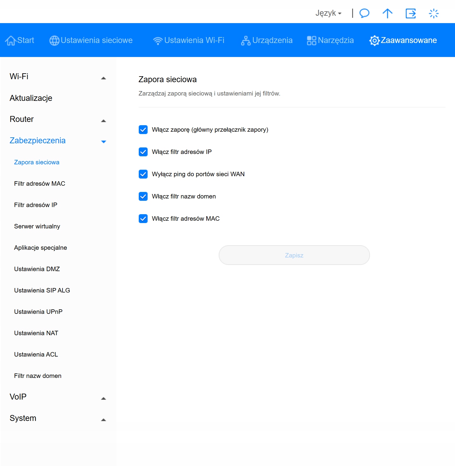 Router ma menu w języku polskim.