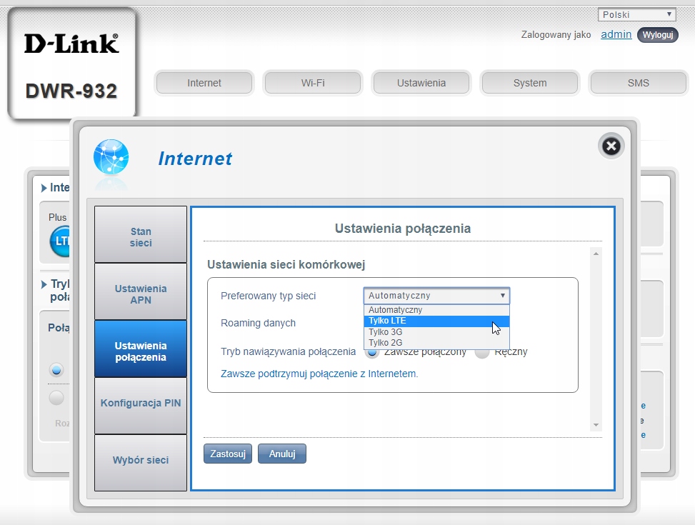 Znajdziesz tu też opcję wymuszenia trybu LTE. Jeżeli masz nielimitowany internet w tym paśmie, to ta opcja będzie bardzo przydatna.