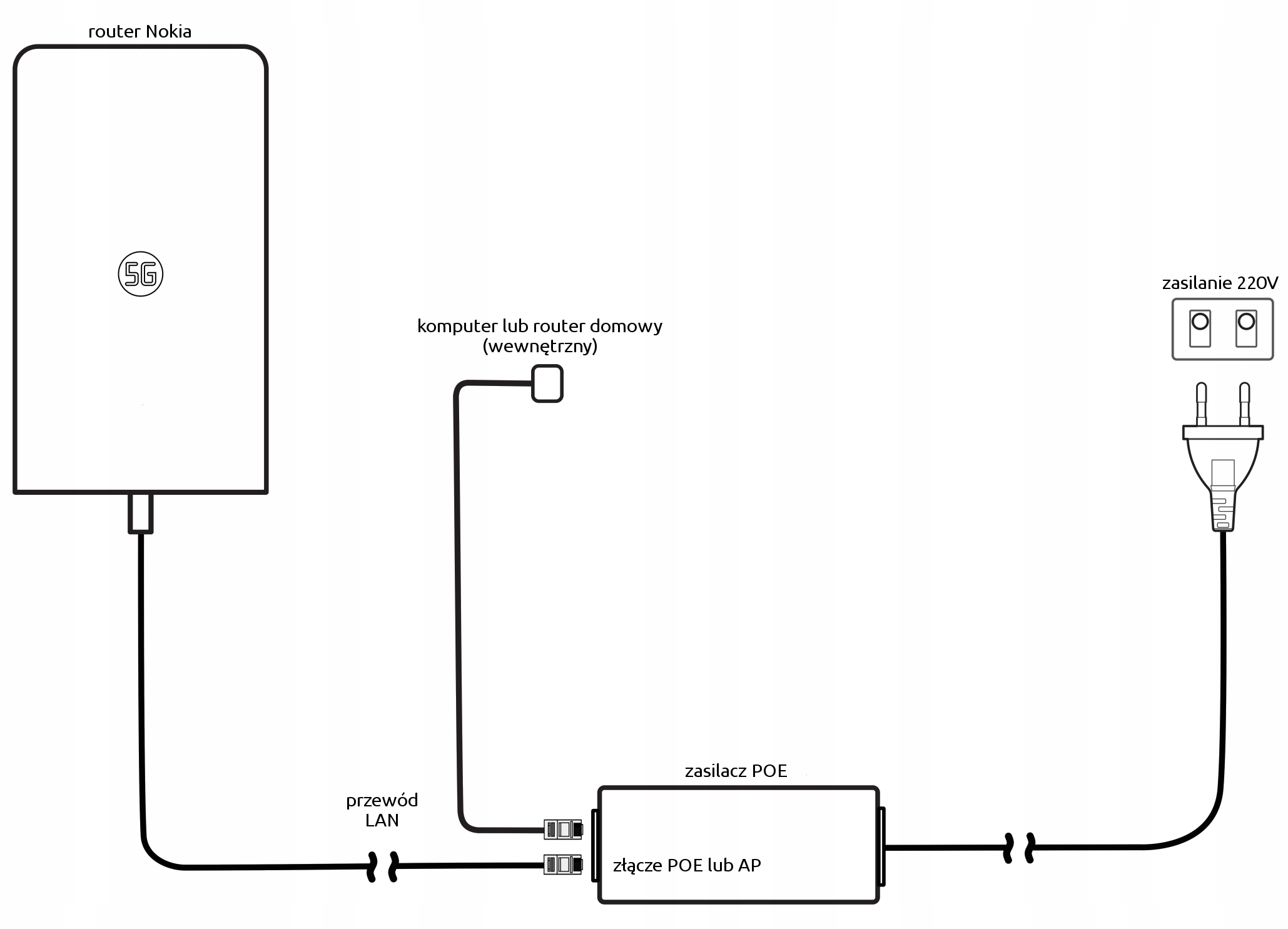 - Otrzymujesz w zestawie dłuższy przewód LAN, podłączasz go z routera (Nokia) do zasilacza.