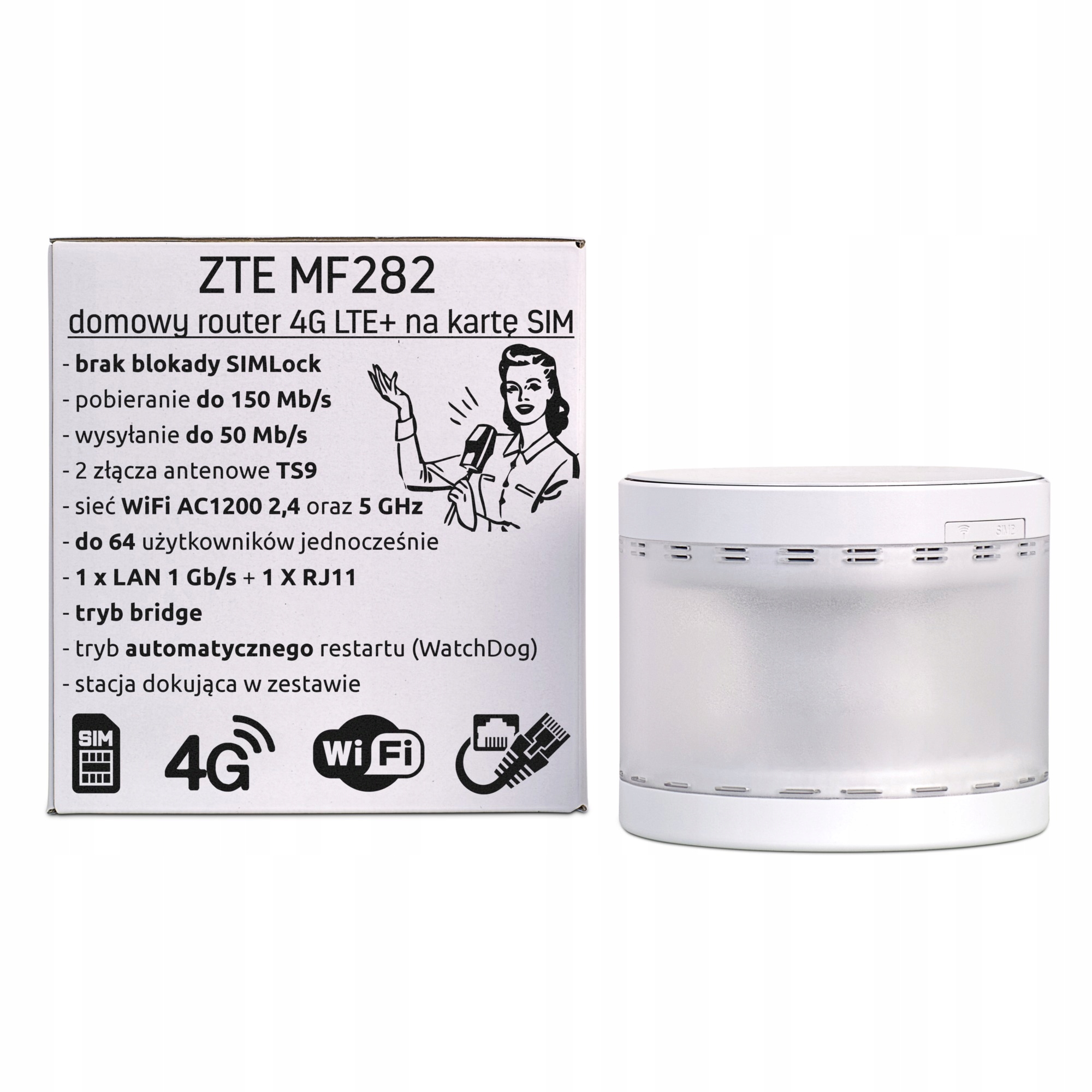 Router obsługuje pasma 2G, 3G oraz 4G LTE i nie ma blokady operatora – zdejmujemy ją przed wysyłką. Działa też z każdym systemem operacyjnym: