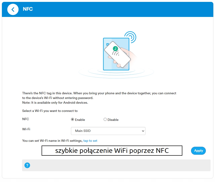 To jednak dalej nie wszystko. Jest dodatkowa funkcja, której nie znajdziesz w innych routerach, a która znacznie ułatwia pracę z urządzeniem. Na jego bocznej krawędzi znajdziesz logo NFC – po przyłożeniu tam telefonu następuje automatyczne połączenie z WiFi – bez wpisywania hasła itd. Przykładasz, naciskasz na telefonie OK i działa. Możesz pomyśleć, że to szczegół, ale zdziwisz się, jak szybko do niego przywykniesz 🙂
